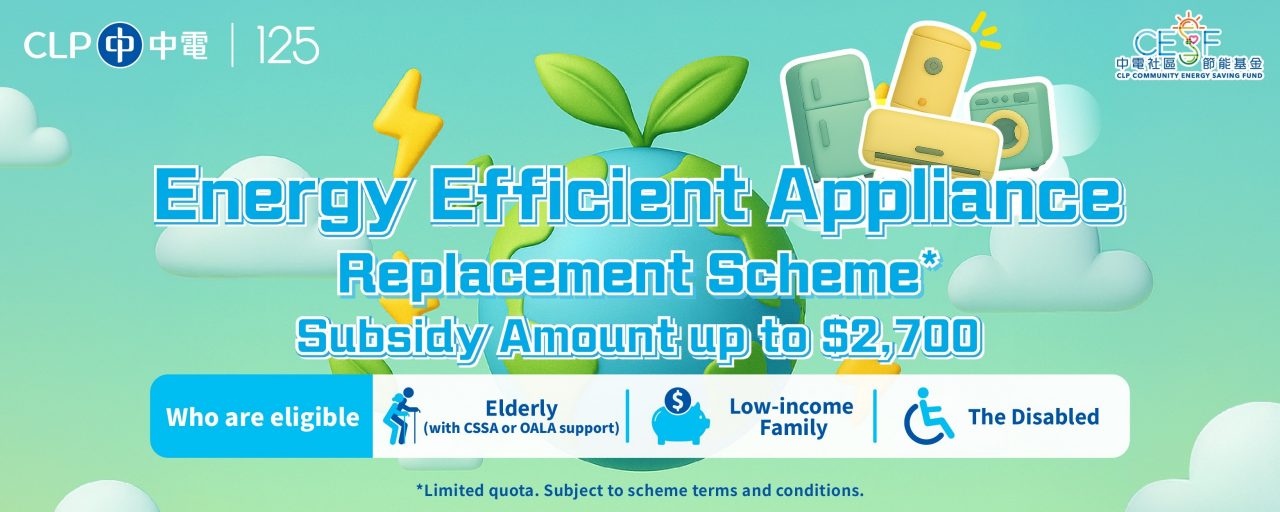 To support disadvantaged communities in replacing energy‑efficient appliances and reducing long‑term electricity expenses, CLP has allocated HK$30 million from the CLP Community Energy Saving Fund this year to launch the Energy Efficient Appliances Replacement Scheme. The Scheme subsidises eligible elderly persons, low‑income families, and persons with disabilities to replace four types of high‑consumption appliances—inverter air conditioners, electric water heaters, refrigerators, and washing machines—with models carrying a Grade 1 Energy Label.