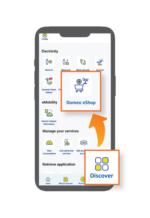 Sign in to your CLP One account, tap "Discover", and "Domeo eShop"