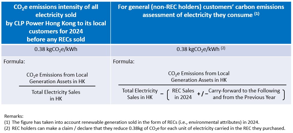 CO₂e emissions intensity of all electricity sold by CLP Power Hong Kong to its local customers for 2024 before any RECs sold is 0.38 kgCO₂/kWh.