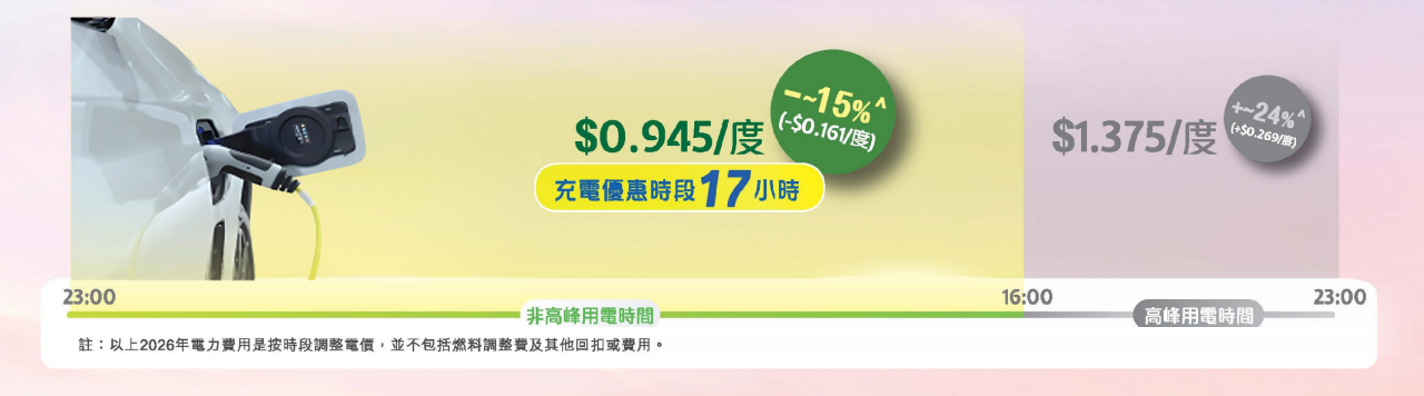 在「非高峰用電時間」充電,可享受較優惠的電力費用,同時有助更有效運用電網資源,減少高峰期負荷。