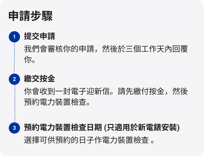 電動車住宅分時段用電價目電力賬戶(如適用)。倘若您不符合電動車住宅分時段用電價目的所有申請條件,我們將為您開設電動車用電價目電力賬戶。您的電動車用電價目或電動車住宅分時段用電價目電力賬戶和您的住宅用電價目電力賬戶各自獨立,並擁有獨立電錶用以量度用電量。